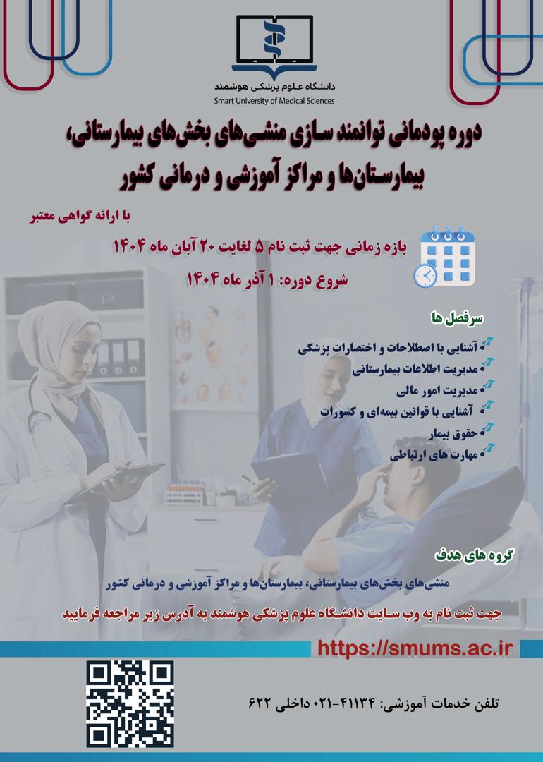 هماهنگونه که مستحضر هستید، در راستای بهره مندی از آموزش های الکترونیکی در جهت ارتقای عدالت آموزشی و همچنین به منظور حمایت از تحقق سیاست های تدوین شده وزارت بهداشت، درمان و آموزش پزشکی و بسته های تحول و نوآوری آموزش علوم پزشکی در زمینه آموزش مجازی، دانشگاه علوم پزشکی هوشمند با همکاری گروه پرستاری دانشگاه علوم پزشکی ایران دوره پودمانی " آموزش و توانمندسازی منشی های شاغل در بخش های بیمارستانی دانشگاه های علوم پزشکی کشور "را طراحی و تدوین نموده است. علاقه مندان گرامی می توانند از تاریخ 5 الی 20 آبان ماه 1404 با مراجعه به سایت دانشگاه علوم پزشکی هوشمند ثبت نام نمایند.